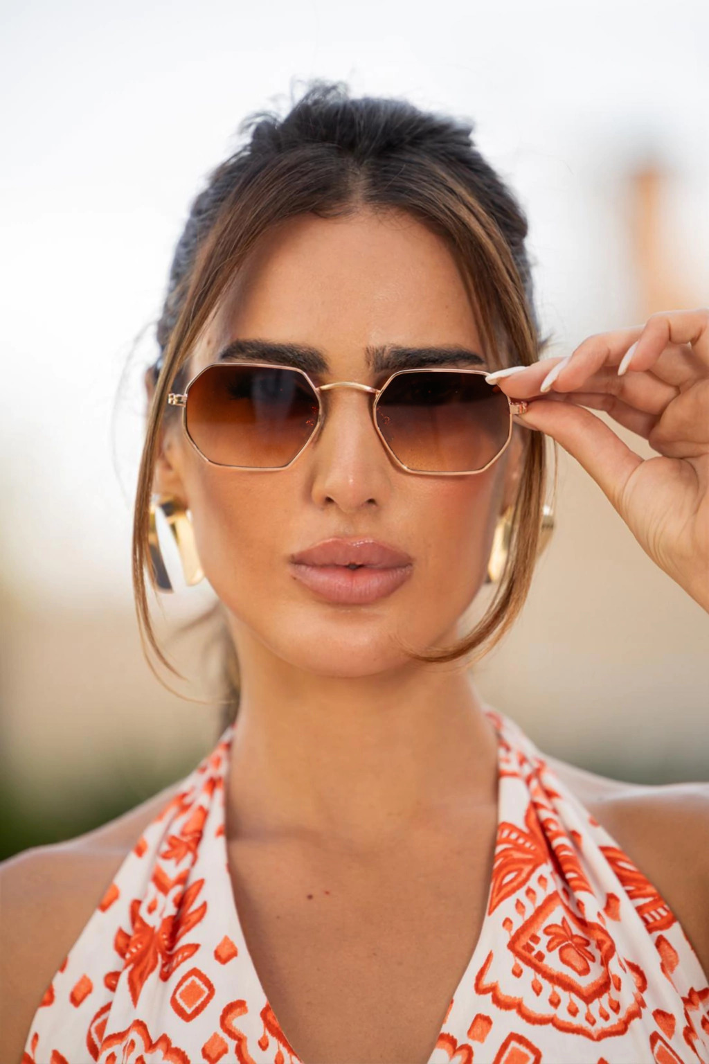 Um óculos de sol sofisticado e contemporâneo, ideal para quem busca elegância com um toque moderno. O design hexagonal aliado ao acabamento em metal dourado traz leveza e personalidade, valorizando diferentes formatos de rosto.