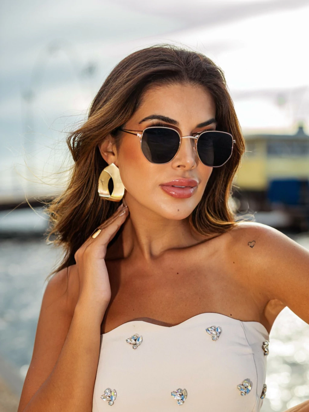 Um óculos de sol com design hexagonal moderno e elegante, ideal para quem busca sofisticação com um toque fashion. A combinação da armação em metal dourado com lentes pretas cria um visual marcante, atual e extremamente versátil.