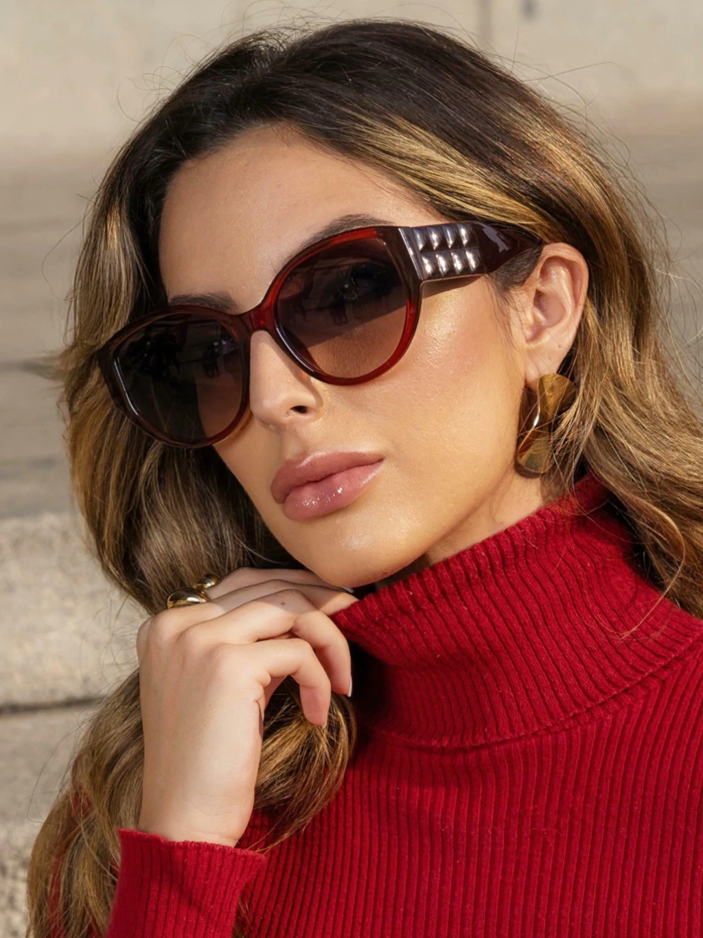Um óculos de sol imponente e sofisticado, perfeito para quem ama elegância com personalidade. O design redondo maxi em acetato bordô traz um visual marcante e feminino, elevando qualquer produção com estilo e presença.
